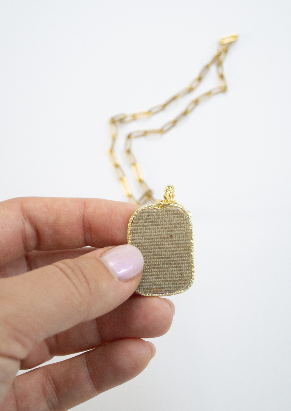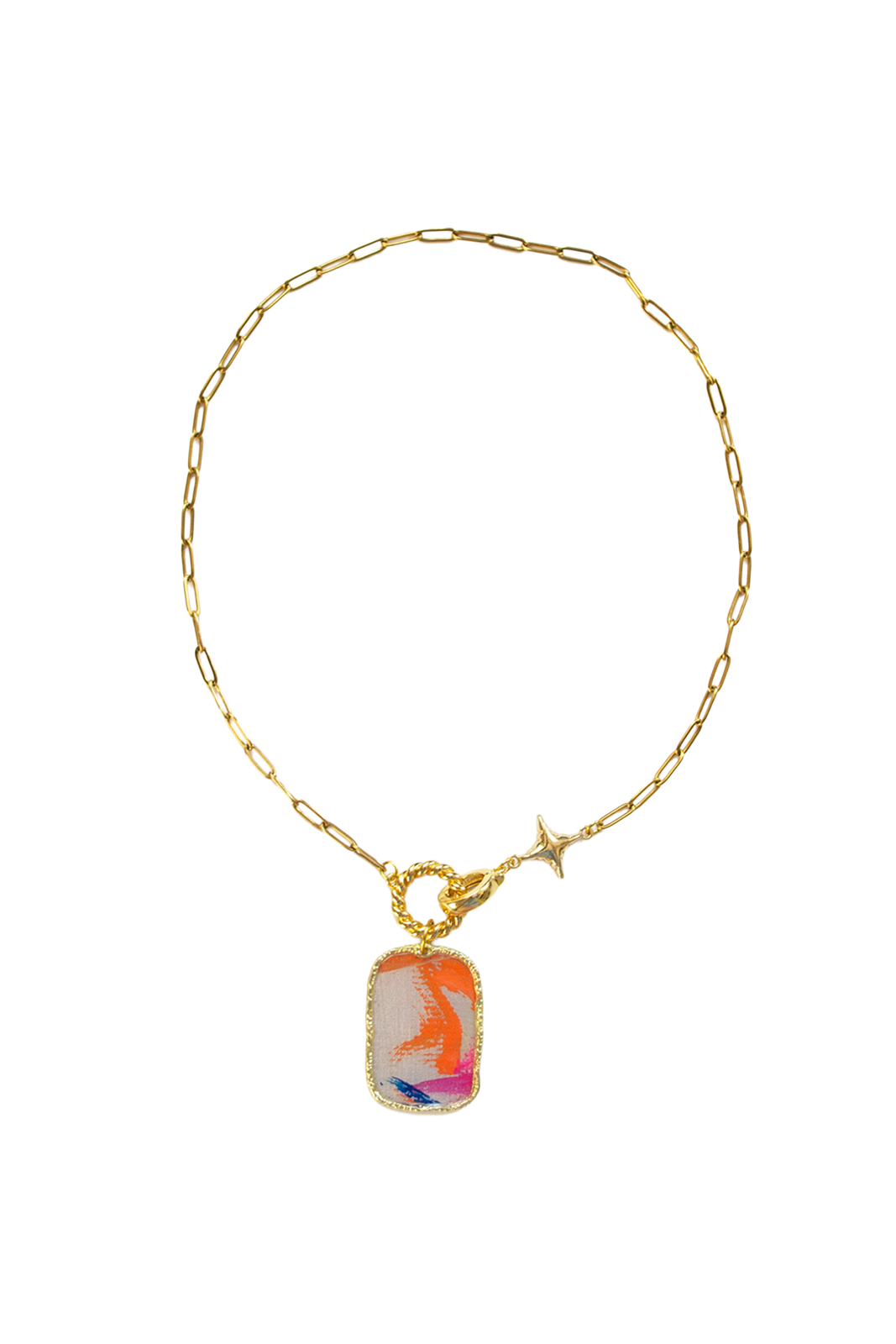 A delicate and radiant necklace, featuring an original artwork signed by Alice, with an intricate gold clasp. Perfect for special occasions or for adding a luminous touch to a minimalist outfit.