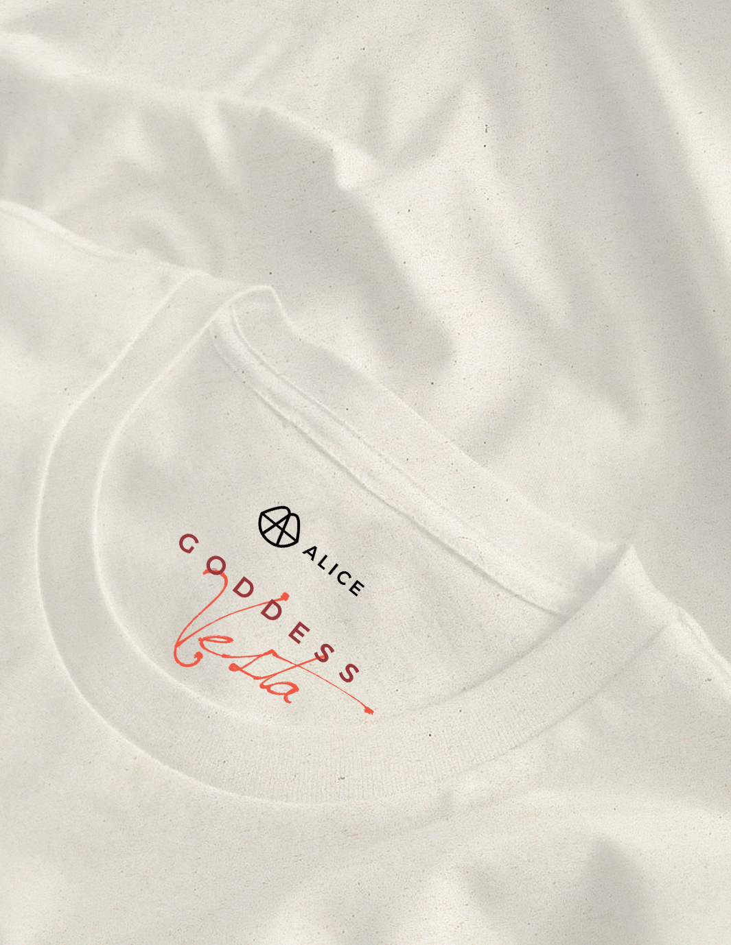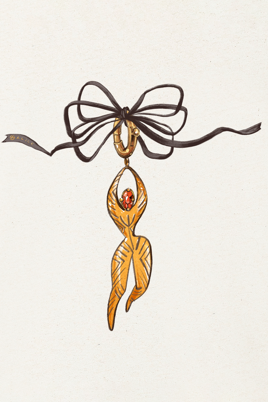 Vesta (Etymology: Inspired by Vesta, the Roman goddess of the sacred fire and hearth. The red color symbolizes passion, power, and creation. Her body posture — extended, with arms raised above the head — evokes dance and solar energy. Symbolism: Goddess of creative passion, vitality, and inner fire) – the axis of the world, the verticality of balance between realms. She is depicted in neutral and golden tones, wearing labradorite, the stone of inner light and harmony.