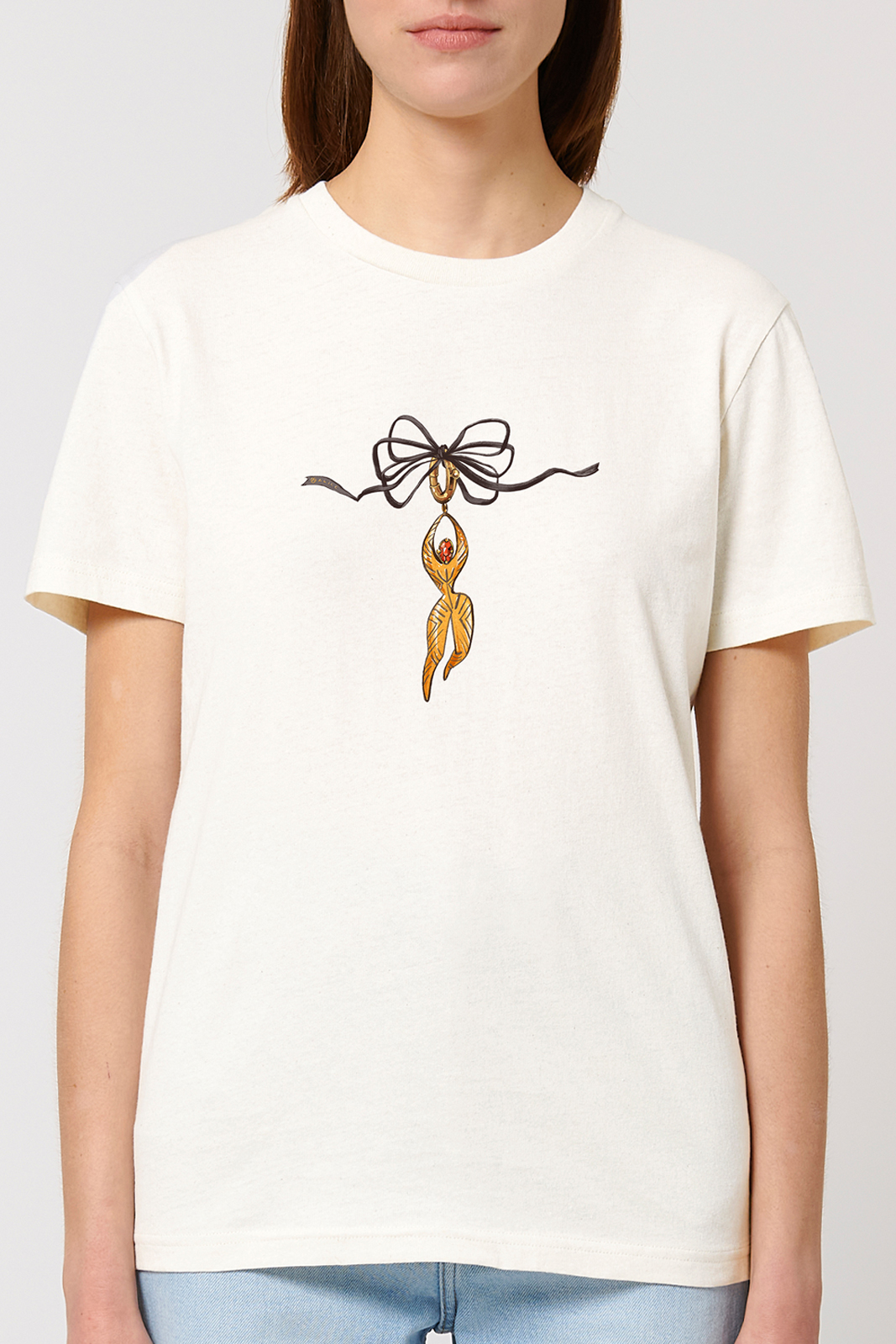 A relaxed-fit T-shirt featuring a bold, playful illustration inspired by Cucuteni artifacts. Made from recycled fabrics and printed using the DTG technique for lasting wear. Bringing love for culture and roots back into style.