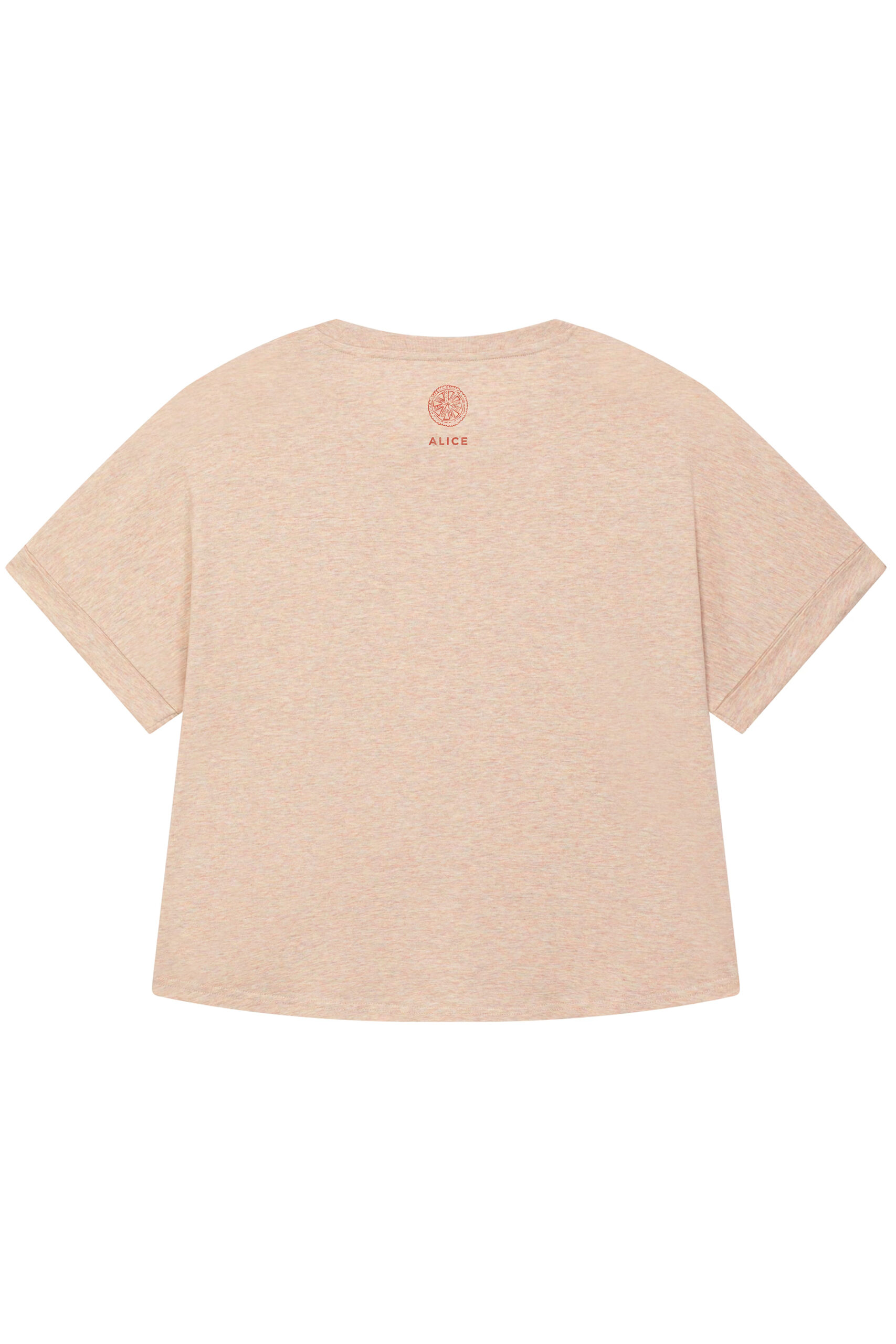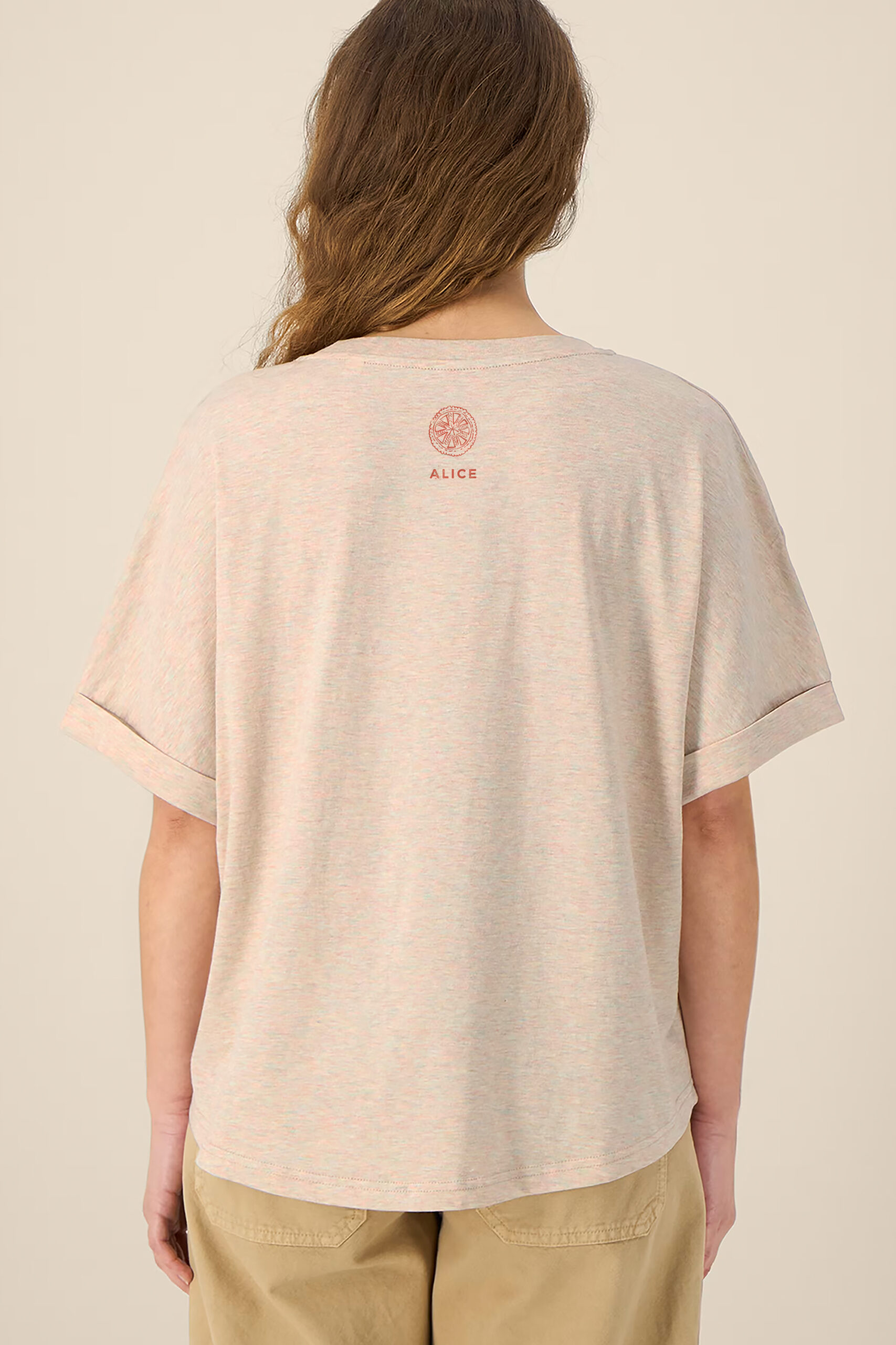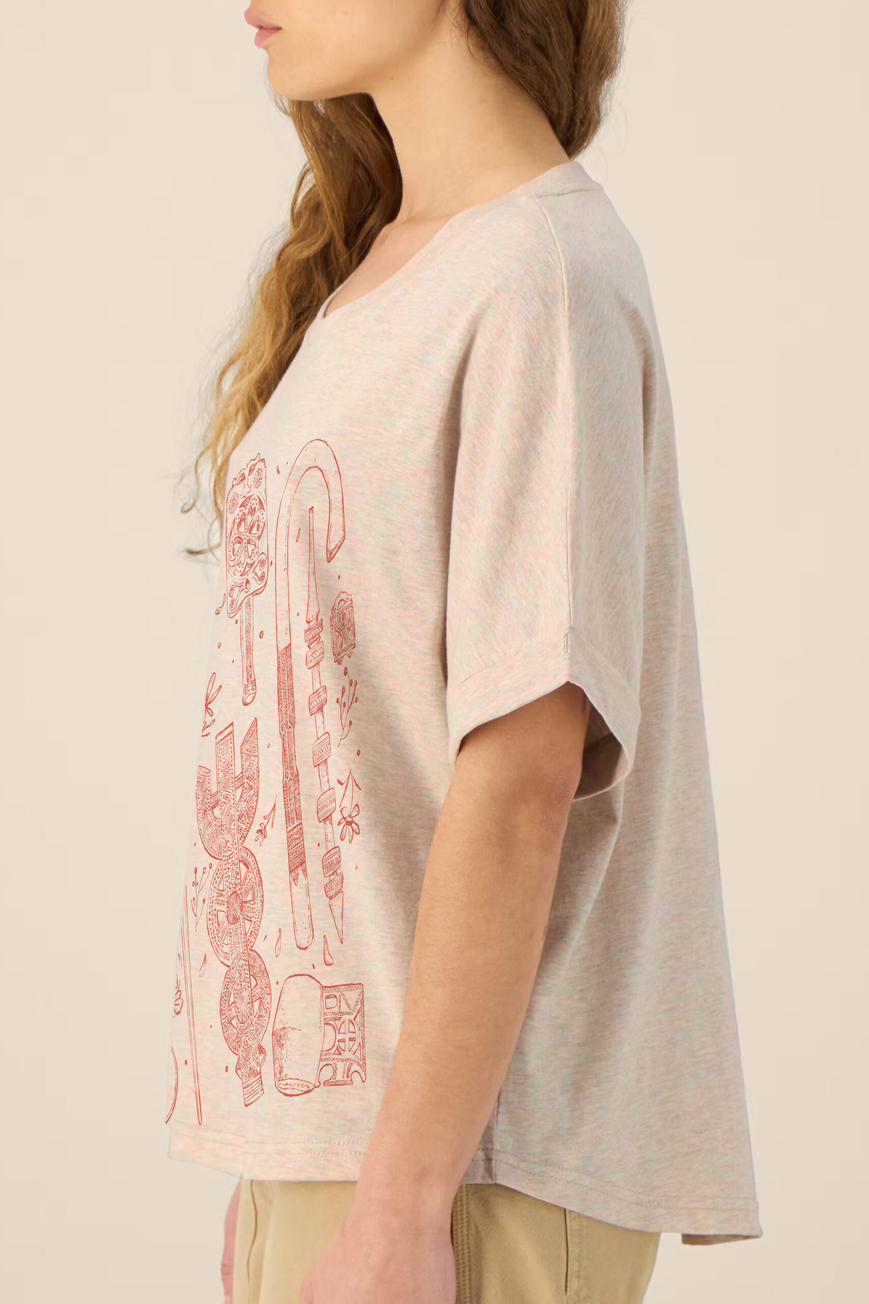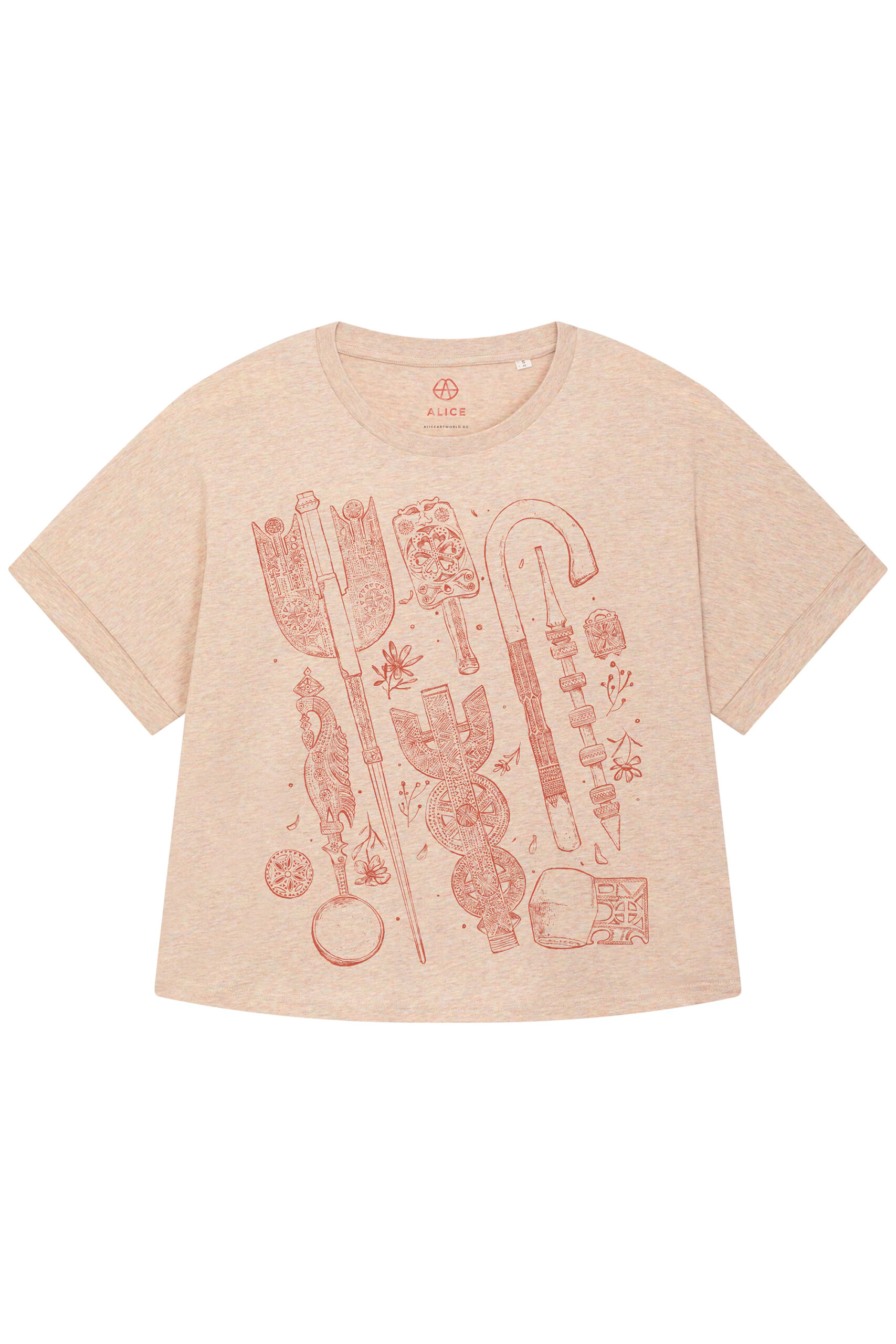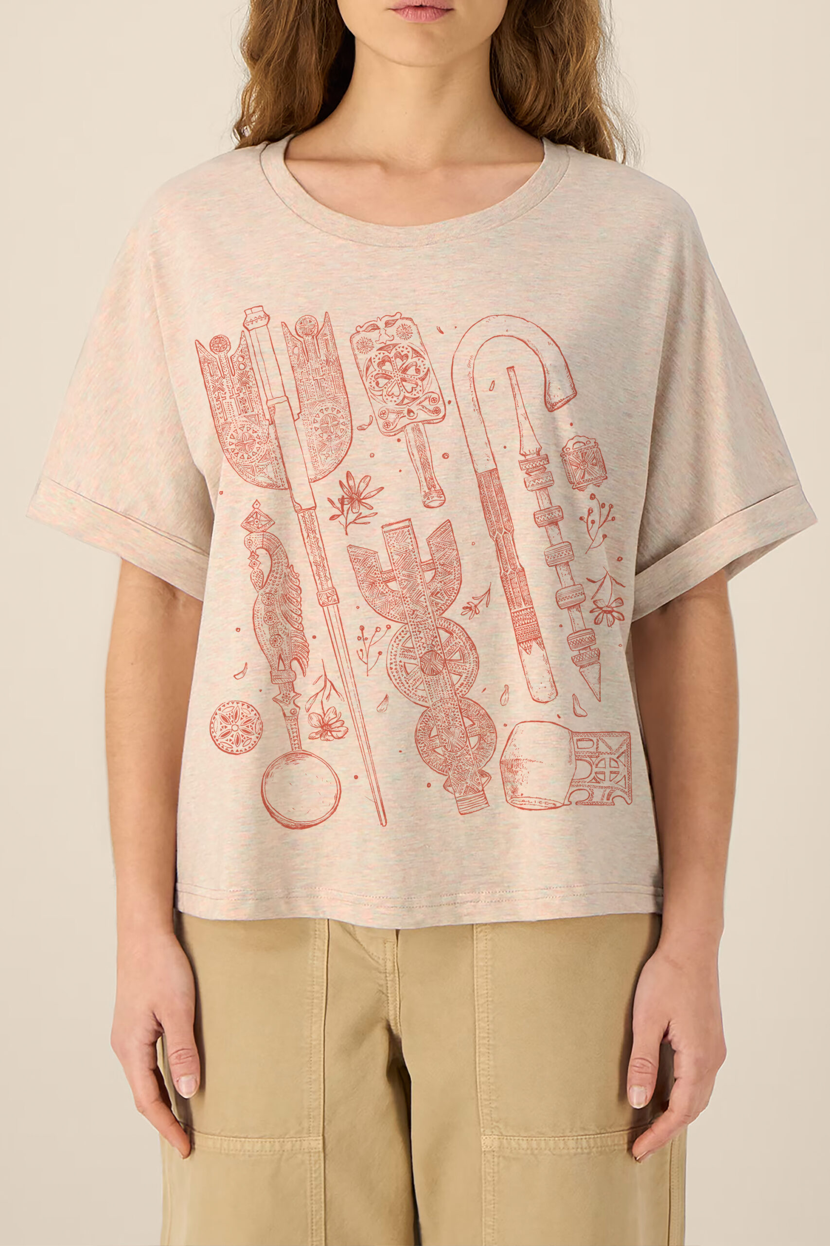 Oversized cotton T-shirt in a warm natural melange, featuring a hand-drawn archive of Romanian carved wood objects — distaffs, spindles, shepherd’s crooks, spoons, and devotional tablets — rendered in warm red line across the front. Each piece reinterprets the ornamental language of traditional woodcarving into a contemporary, wearable form.