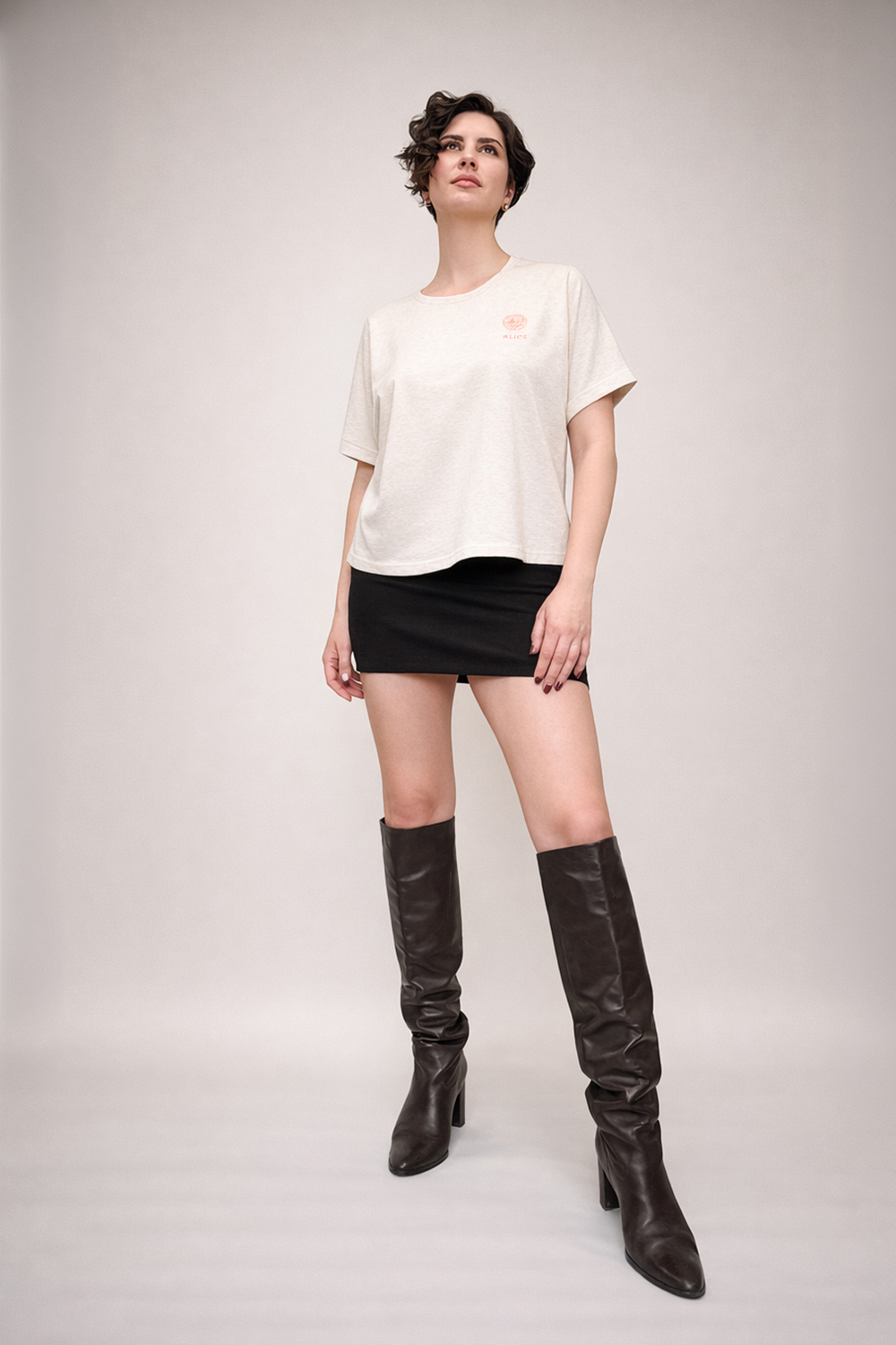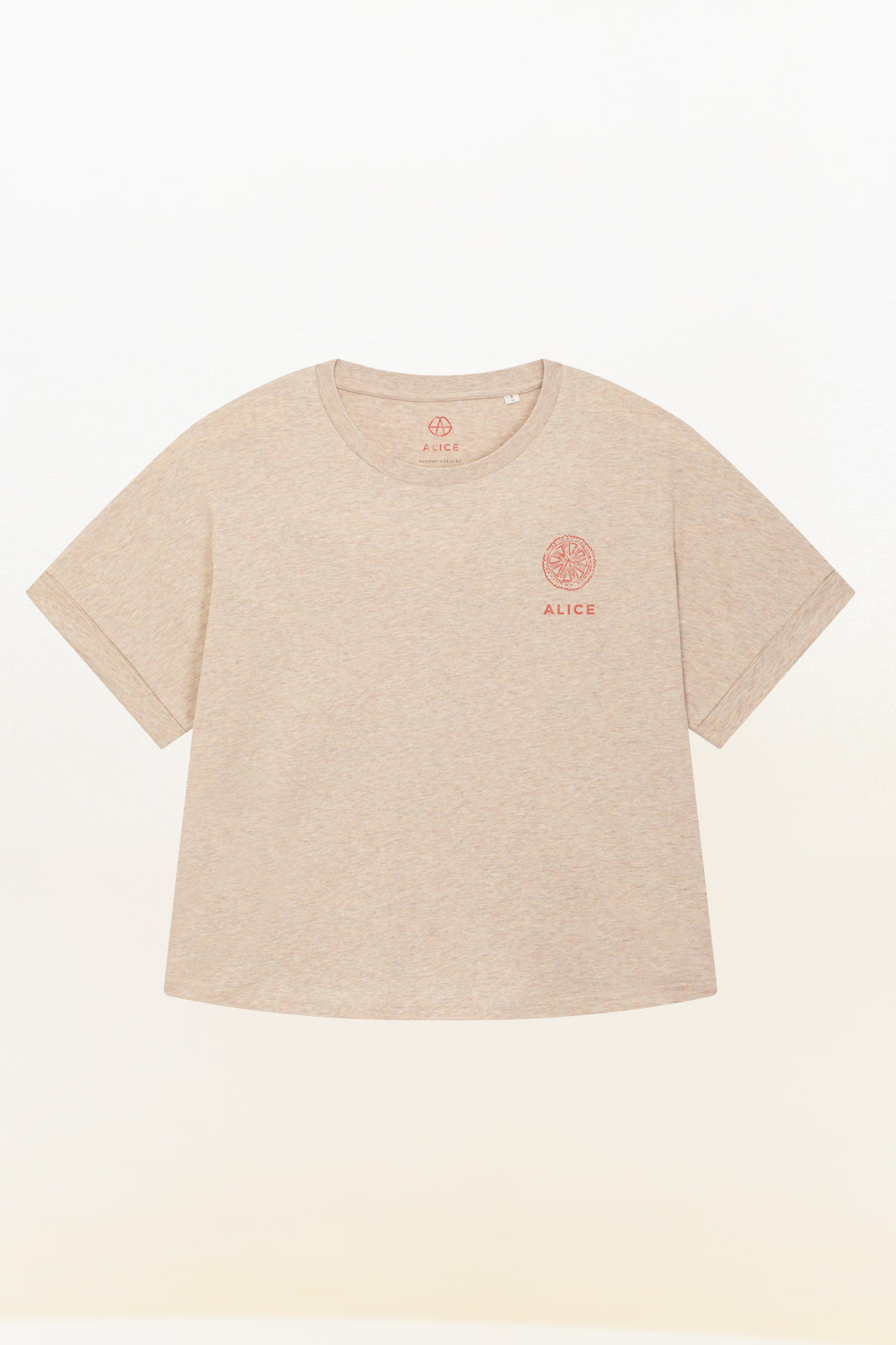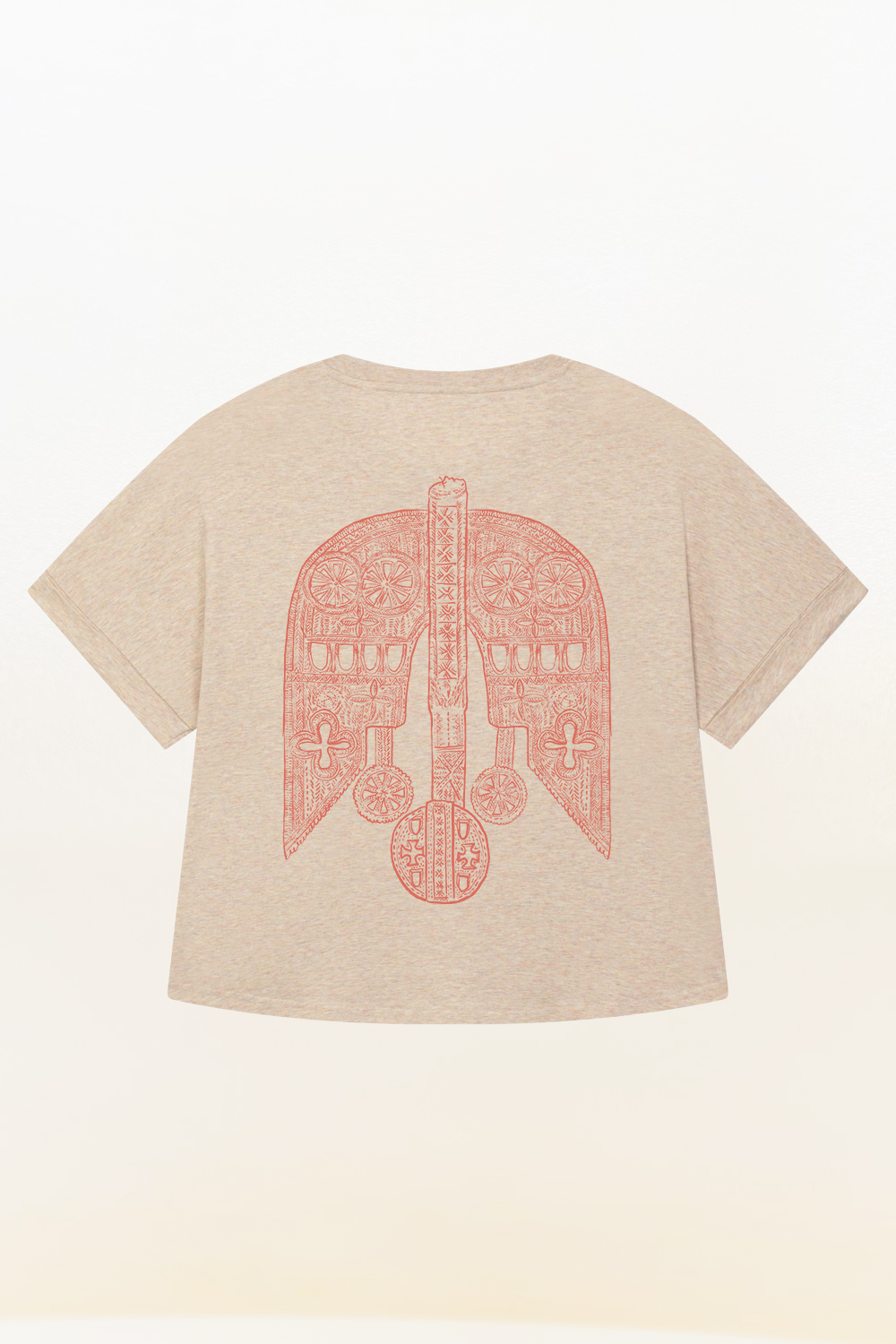Crafted from soft cotton in a natural tone, the T-shirt features an oversized silhouette that offers freedom, fluidity, and an effortlessly refined aesthetic. The warm red print evokes traditional pigments and carries the vital energy of ancient symbols.
