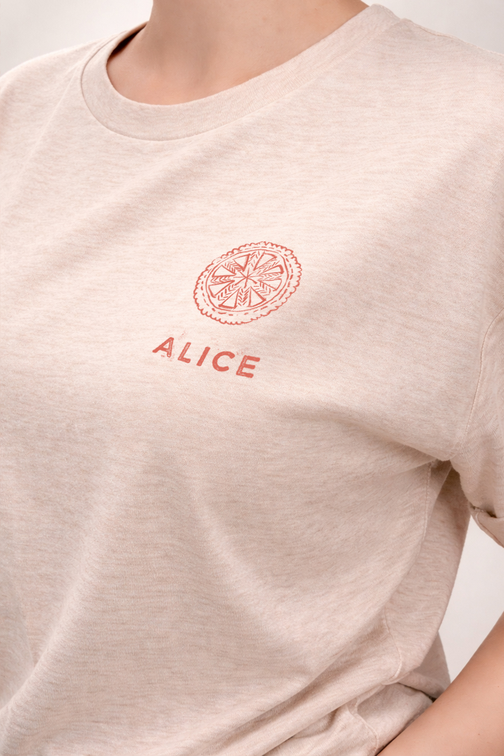 On the front, a subtle mark — the ALICE seal — anchors the piece within the artistic universe of the brand, while the back becomes a narrative canvas, where symbol and story unfold.
