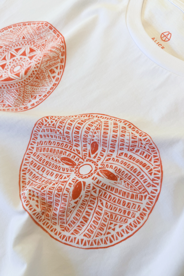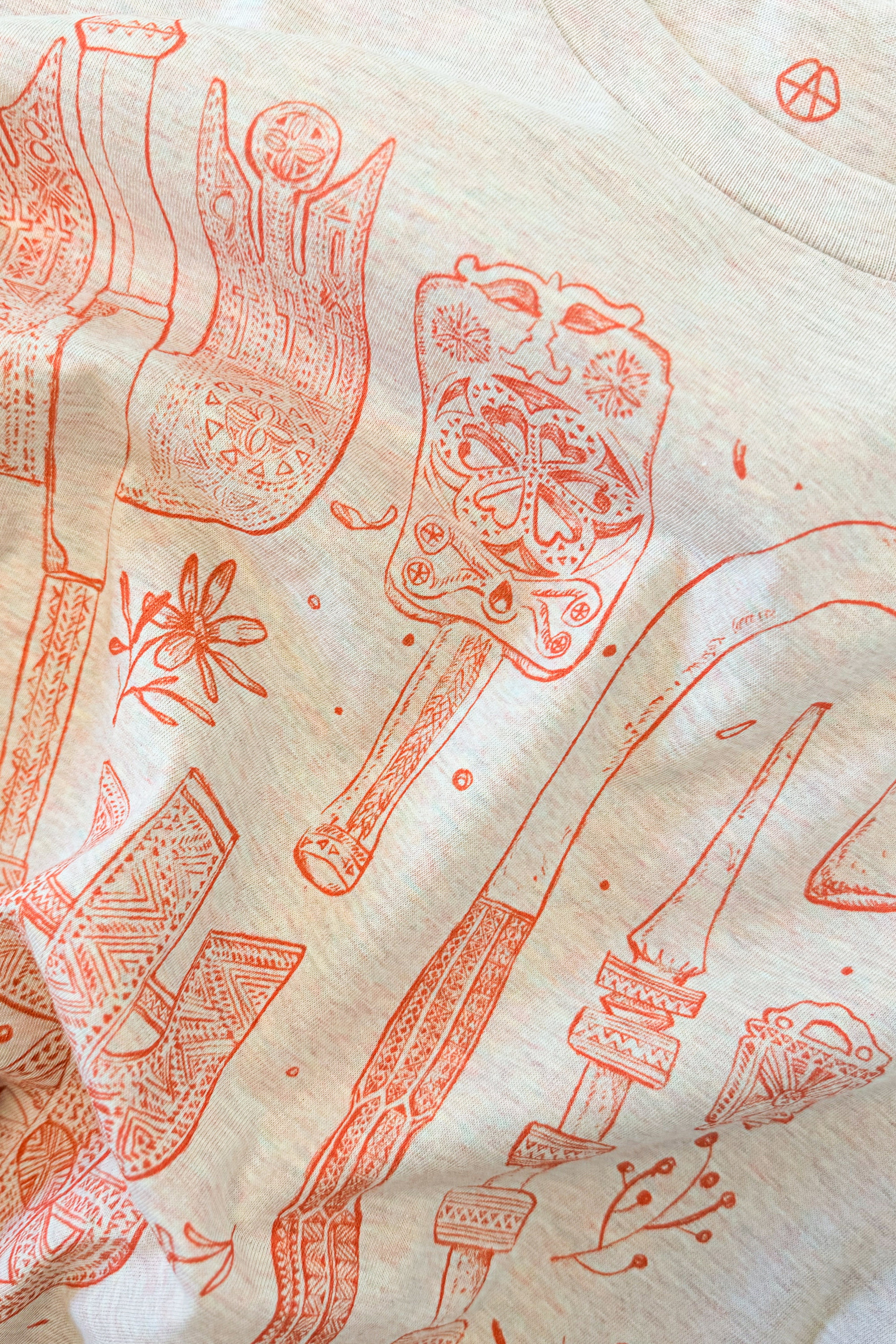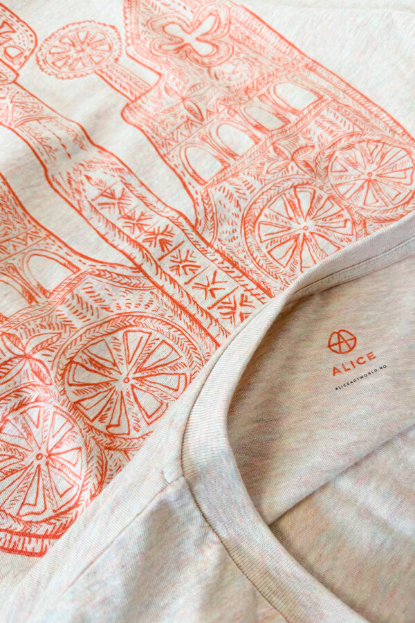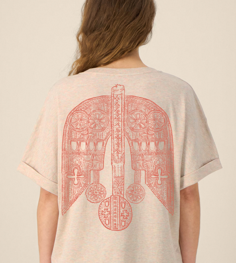 Tricou supradimensionat din bumbac într-un melanj natural cald, cu o arhivă desenată manual de obiecte din lemn românesc sculptat – roate de tors, suveici, cârje de cioban, linguri şi tăbliţe de rugăciune – conturate în roşu cald pe partea frontală. Fiecare piesă reinterpretează limbajul ornamental al sculpturii tradiţionale în lemn într-o formă contemporană, purtabilă.